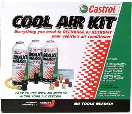 Castrol Cool Air KitCastrol Cool Air Kit Detail : Use kit to replace lost refrigerant in existing R-134a sytstem. Each can of Castrol Maxi Charge contains: *11 oz. of R-134a refrigerant*2 oz. of high performance lubricant*1 oz. of leak sealer and sytstem conditioner. Also contains red leak detector to pinpoint leaks. Use kit to retrofit an R-12 A/C system to R134-a in three steps: 1-Attach R134-a adapter fittings onto existing R-12 fittings. 2-Charge system with Castrol Maxi Charge. 3-Apply retrofit label.